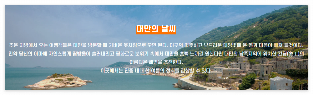 - 대만은 1년 내내 온화한 기후를 자랑하며, 겨울에도 영상 10도 이상으로 비교적 따뜻한 편입니다.